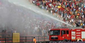 Eskişehirspor-Trabzonspor maçının devre arasında yüksek sıcaklıktan etkilenen Eskişehirspor taraftarı itfaiyenin sıktığı su ile serinledi.