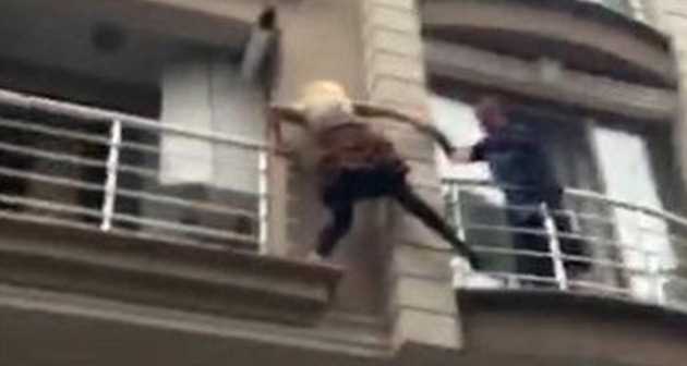 Kadını kurtarmaya çalışan şahıs , elini uzatarak balkondan diğer balkona genç kadını çekti.