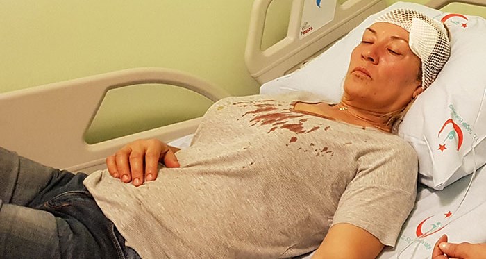 Kendisinin uygun bir dille konuşmasına rağmen çirkin küfür ve hakaretlere maruz kaldığını ifade eden Hazar, "Oradaki bir bayan tehditlerle taşları aldı üzerime doğru geldi. Önce bir vurma çabası oldu. Omzuma ya da koluma vurdu o an ama hatırlayamıyorum. Ben de kendimi savunup elimi uzatmak isterken bu sefer büyük bir taşı aldı başıma attı. O arada polis arayacağımı söyledim. Bayan hızlı bir şekilde kaçtı. Bayanın peşinden gidemedim çünkü gerçekten canım çok yanıyordu ve kanlar içerisinde kalmıştım. Polis geldi, ambulansı aramışlar. Şu anda da hastanede gözlem altındayım, darp edildim" şeklinde konuştu.