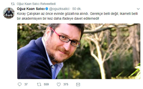 ''Koray Çalışkan az önce evinde gözaltına alındı. Gerekçe belli değil, ikameti belli bir akademisyen bir kez daha ifadeye davet edilemedi.''