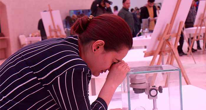 AÜ Türk Dünyası Bilim, Sanat ve Kültür Merkezi Müdürü Mehmet Topal ve sanatçı Korkmaz'ın katılımıyla açılan, sadece mikroskop ve büyüteçle görülebilen eserler, ziyaretçilerden ilgi gördü.