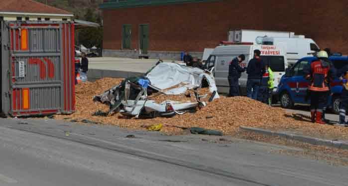 Edinilen bilgiye göre, Tavşanlı’dan Bursa istikametine giden Enes Göçmen (28) yönetimindeki 43AAU 042 plakalı talaş yüklü tır, Ali Özkan’nın (42) kullandığı 43 RT 281 plakalı otomobilin üzerine devrildi.
