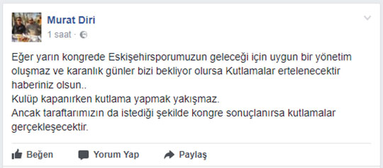 Diri sosyal medya hesabından yarınki Eskişehirspor kongresi ile ilgili açıklama yaptı. Diri açıklamasında şunları söyledi;