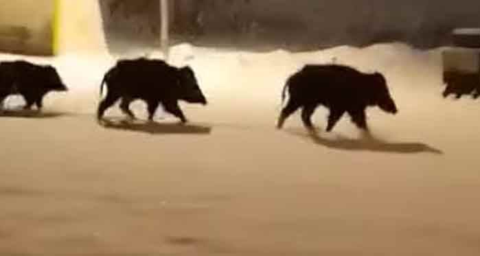 Kütahya'nın Tavşanlı ilçesinde aç kalan domuz sürüsü şehre indi. O anlar bir vatandaş tarafından saniye saniye cep telefonuyla görüntülendi. Geçtiğimiz günlerde Bursa'da da aç kalan kurtlar şehre inmişti.