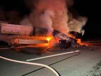Kütahya’nın Tavşanlı ilçesinde mermer yüklü tırın dorsesi alev alev yandı.