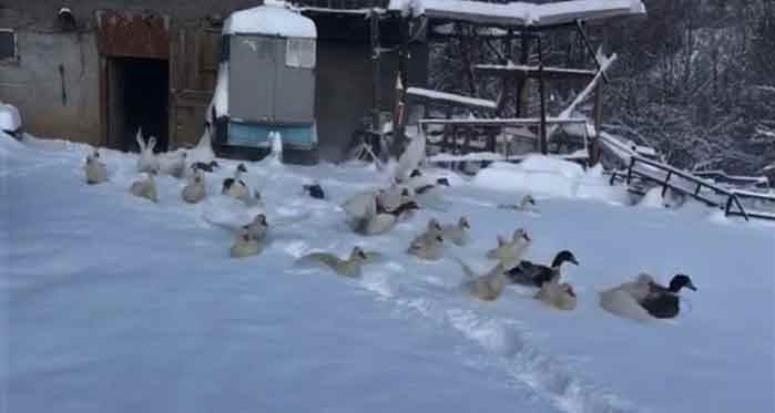 Kütahya haberi: Kütahya’da bir çiftlik sahibinin beslediği kaz ve ördeklerin gülümseten ’kar sevinci’ kameraya yansıdı.