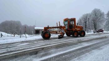 Karayolları ekipleri kar küreme araçları ve greyderlerle yolu açık tutabilmek için çalışmalarını sürdürüyor.