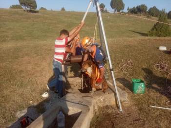 Çekme halatıyla kuyuya inen bir AFAD personeli, 30 dakika süren çalışmanın ardından köpeği başarılı şekilde dışarı çıkardı.
