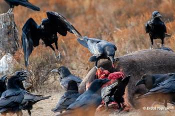 Afyonkarahisar Doğa Koruma ve Milli Parklar Bölge Müdürlüğü tarafından fotoğraflanan bir avı parçalayan kuzgunlar sosyal medyada büyük ilgi gördü.