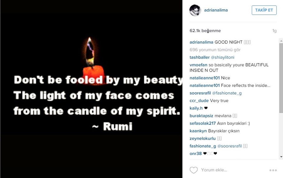 Dünyaca ünlü top model Adriana Lima, 14 Şubat Sevgililer Günü'nünde sosyal paylaşım sitesi Instagram’dan Mevlana’ya ait bir ‘Bir mum diğerini tutuşturmakla ışığından bir şey kaybetmez ‘cümlesinin İngilizcesini paylaştı.