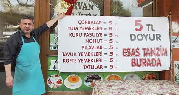 Balıkesir'in Burhaniye ilçesinde, devletin yaptığı tanzim satışlardan etkilenen lokantacı Bülent Gür, çorbasından köftesine kadar bütün yemek çeşitlerini 5 liraya indirdi. Kampanyanın ilgi gördüğünü belirten Gür, hem kendisinin hem de müşterilerin karnının doyduğunu söyledi.