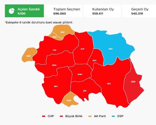 CHP mevcut belediyelere yenilerini eklemişti. Seyitgazi ve Alpu belediyeleri artık CHP’nindi. Dahası Mihalıççık’ı da DSP kazanmıştı. Çifteler ise ittifak ortakları MHP’nin olmuştu.