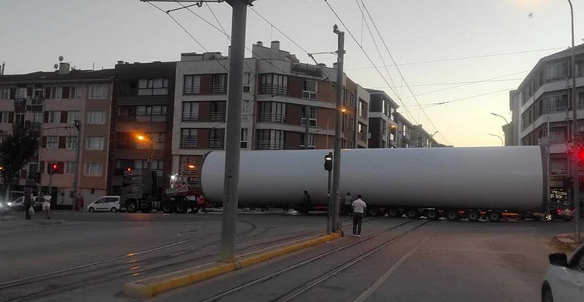 Tır dorsesinde tam 86 tonluk rüzgar türbini gövdesini taşıyor.