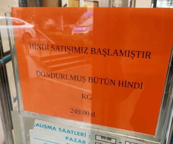 İşte bu zincir marketimizde hindi satışları başladı. Duyurusunu da astılar. Dondurulmuş hindi 249 liradan satışa sunuluyor.