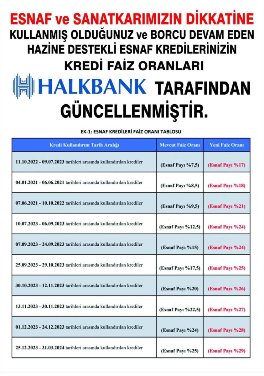 Halkbank tarafından sunulan Hazine destekli esnaf kefalet kredi faizleri bir gecede arttırıldı.