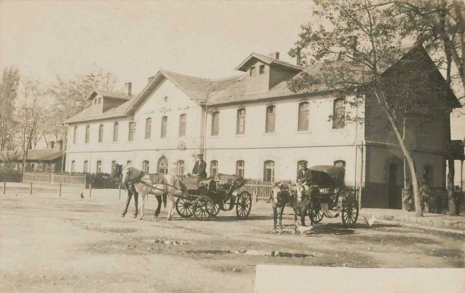 Eskişehir’in eski istasyon binası. Henüz taksi durakları yok. Bina önünde müşteri bekleyen faytoncular var.