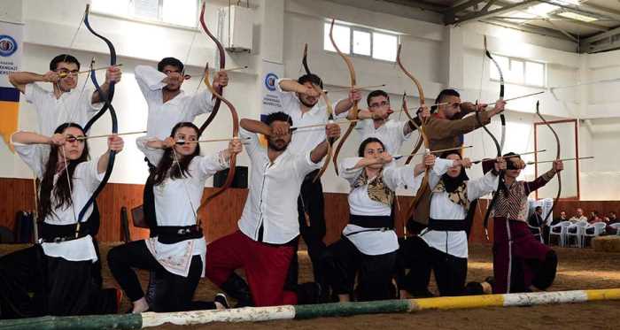 MAMYO Binicilik ve Hipoterapi Tesisleri’nde düzenlenen tören, renkli görüntülere sahne oldu. MAMYO’da önümüzdeki günlerde düzenlenecek at bayramı öncesinde, şenliklerde yapılacak gösterilerin bir kısmı mezuniyet programına da eklendi. ESOGÜ öğrencileri arasında yer alan Türkmen öğrencilerin de geleneksel kıyafetleriyle katıldığı ve Türkmen Pilavı ikramıyla başlayan şenlikler, ESOGÜ ve Anadolu Üniversitesi Geleneksel Okçuluk Kulüplerinin ok atışlarıyla devam etti. Ardından, Anadolu Üniversitesi Güzel Sanatlar Fakültesi Seramik Bölümü öğretim üyesi Yrd.Doç. Sadettin Aygün ve 1. sınıf öğrencilerinin at konulu dönem çalışmalarının bulunduğu serginin açılışı yapıldı. Sergi açılışının ardından mezuniyet törenine geçildi.