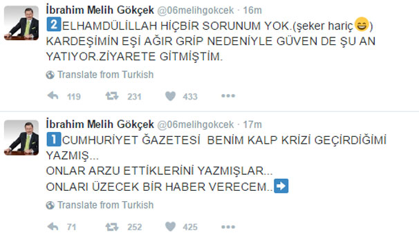 Kalp krizi geçirdiği iddia edilen Melih Gökçek ise, Twitter adresinden açıklamalarda bulundu.Gökçek "Elhamdülillah hiçbir sorunum yok (Şeker hariç). Kardeşimin eşi ağır grip nedeniyle Güven'de (Güven Hastanesi'nde) şu an yatıyor. Ziyarete gitmiştim" ifadelerini paylaştı.