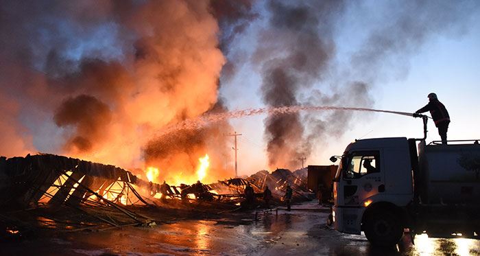 Alınan bilgiye göre, sabah saat 05.00 sıralarında Hal kompleksi içinde bulunan boş plastik kasaların istiflendiği ve yan yana 18 adet şekilde sıralanmış olan depolarda henüz bilinmeyen nedenle çıkan yangın, bir anda depoların tamamını sardı.