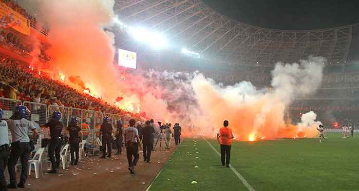 Antalya’da oynanan TFF 1. Lig Play-Off finalinde Eskişehirspor ile Göztepe arasında oynanan maçta sahaya yabancı madde ve meşale atan taraftarlar tespit edildi.