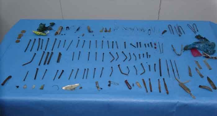 Genç kadın hastanın midesinden tırnak makası, çakı, meyve bıçağı, cımbız, çivi, iğne, çuvaldız, tığ, vida, çengelli iğne, anahtar, madeni para, saç tokası gibi metal parçalarıyla plastik ve cam parçaları çıkarıldı. Meyve bıçağı gibi kesici cisimlerin bir poşete sarılı vaziyette olması ise doktorların dikkatini çekti. Midesinden çıkan 158 cisimle doktorları hayrete düşüren hasta, sağlığına kavuşmasının ardından taburcu ediliyor.