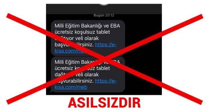 Milli Eğitim Bakanlığı, vatandaşları "Milli Eğitim Bakanlığı ve EBA ücretsiz, koşulsuz tablet dağıtıyor. Veli olarak başvuru için tıklayınız" şeklindeki sahte mesaj linklerine giriş yapmamaları konusunda uyardı
