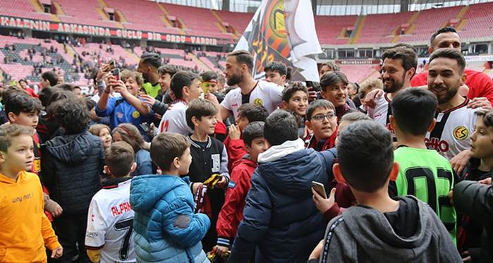Eskişehirspor'un Kaynaşlı Belediyespor'u 2-1 yendiği maçın ardından sahada duygusal ve umut dolu anlar yaşandı. Emniyet güçlerinin izniyle yüzlerce Eskişehirspor forması giyen çocuk sahaya girerek futbolcularla birlikte galibiyeti kutladı.
