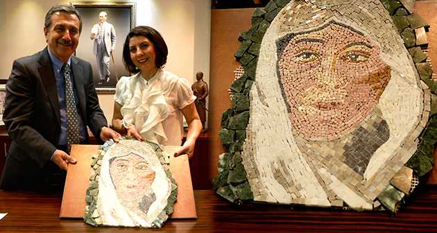 Sanatçı Sevim Akdoğan tarafından hazırlanan el yapımı mozaik, Zübeyde Hanım portresi, Kültür Merkezinde yerini alması için Başkan Ataç’a teslim edildi.