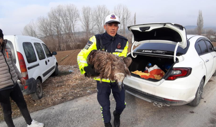 Abant Gölü Milli Parkı ile Mudurnu ilçesini birbirine bağlayan yolda jandarma ekipleri devriye nöbetine çıktı. Rutin denetim faaliyetlerini sürdüren ekipler, yol kenarında yaralı bir akbaba gördü. Hayvanın kanadından yaralı olduğunu gören ekipler, ekip aracıyla akbabayı jandarma karakoluna götürdü. İlçe veterineri Ahmet Baş'ın karakolda kontrollerini yaptığı akbabanın çok kan kaybettiği ve kanadının kırık olduğu tespit edildi. Bolu Doğa Koruma ve Milli Parklar Şube Müdürlüğü ekipleri tarafından yaralı akbaba tedavisi yapılmak üzere jandarmadan teslim alındı.