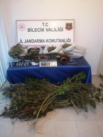 Alınan bilgilere göre, Bilecik İl Jandarma Komutanlığı ekipleri ve uyuşturucu madde arama köpeği ’’Diyar’’ ile birlikte Bilecik’in Pazaryeri ilçesinde bir ihbar sonucu bir bağ evinde arama yapıldı. Yapılan aramalarda G.K.’ye ait olan ev ve eklentilerinde 7.280 gram kubar esrar, 244 kök kenevir bitkisi, 168 gram kenevir tohumu, 1 adet tabanca, 25 adet tabanca fişeği, 1 adet av tüfeği, 28 adetav tüfeği fişeği ile 1 adet terazi ele geçirildi. Olayla ilgili olarak G.K. isimli şüpheli gözaltına alınarak hakkında adli işlem başlatıldı.