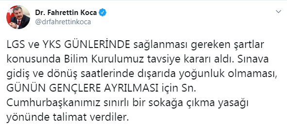 Koca, Twitter hesabından yaptığı açıklamada, "LGS ve YKS günlerinde sağlanması gereken şartlar konusunda Bilim Kurulumuz tavsiye kararı aldı. Sınava gidiş ve dönüş saatlerinde dışarıda yoğunluk olmaması, günün gençlere ayrılması için Sn. Cumhurbaşkanımız sınırlı bir sokağa çıkma yasağı yönünde talimat verdiler" dedi.