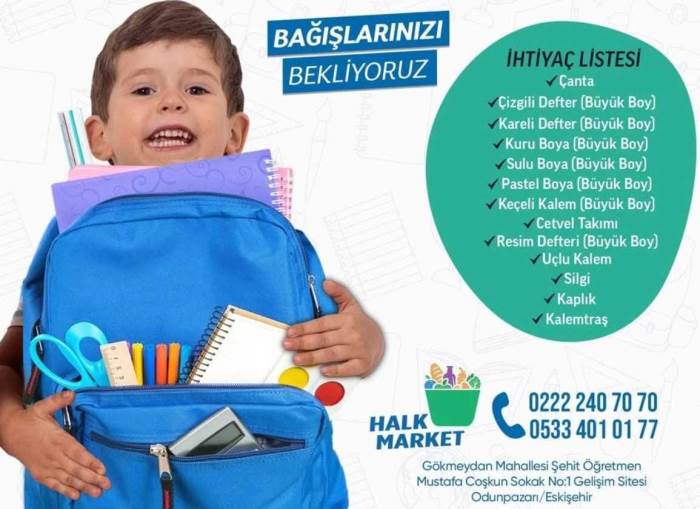 “Bağışlarınızı bekliyoruz” sloganıyla duyurulan kampanyanın ihtiyaç listesinde; çanta, çizgili ve kareli defter, boya kalemleri, cetvel takımı, silgi, kaplık, kalemtıraş gibi okul malzemeleri yer alıyor.