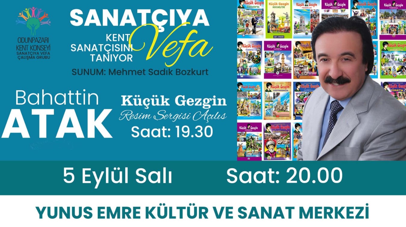 Odunpazarı Kent Konseyi sanatçısını unutmuyor. Kent Konseyi Çalışma Grubu tarafından anlamlı bir gece düzenlenecek. Sanatçıya Vefa ismiyle düzenlenecek gece Eskişehir’in tanınmış simalarından çizgi roman ve ses sanatçısı, aynı zamanda yazar olan Bahattin Atak adına yapılacak. Etkinlik 5 Eylül tarihinde saat 19:30’da Yunus Emre Kültür ve Sanat Merkezi’nde düzenlenecek. Bahattin Atak’ın eserlerinin de sergileneceği vefa gecesinde Mehmet Sadık Bozkurt’un sunumuyla bir söyleşi gerçekleşecek. Vefa gecesine tüm Eskişehirliler davet edilirken, Eskişehirliler hem sanatçısını yakından tanıyacak, hem de Bahattin Atak’ın ‘Küçük Gezgin’ sergisini inceleme fırsatı bulacak.