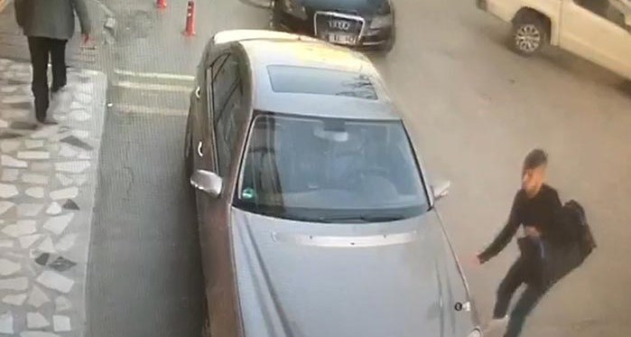 Bir iş yerinin güvenlik kamerası tarafından görüntülenen kazada, elinde valizi bulunan bir vatandaş aracın üzerine doğru geldiğini fark edince kaçtı.