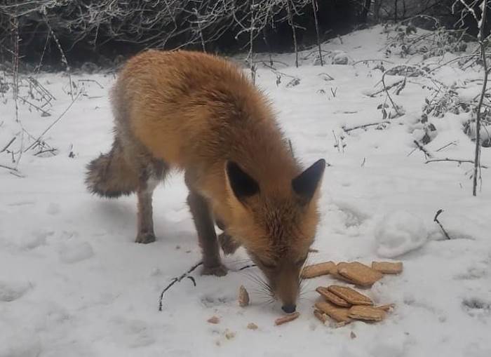 Ormanda karşılarına çıkan tilkiyi bisküvi ile beslediler