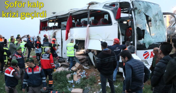 Aksaray'da yolcu otobüsü, şoförü direksiyon başında kalp rahatsızlığı geçirince şarampole devrildi. Kazada 4 kişi hayatını kaybetti, 34 kişi yaralandı.