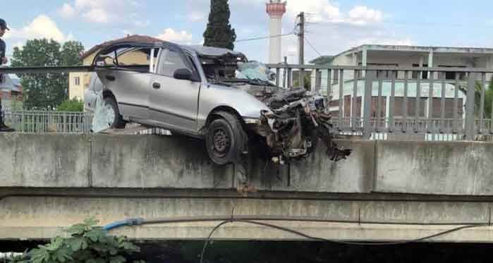 Samsun'da yoldan çıkan otomobilin köprünün korkuluklarına çarpması sonucu meydana gelen kazada köprünün demir korkuluğunun ok gibi saplandığı araçtaki sürücü kazayı yaralı olarak atlattı.
