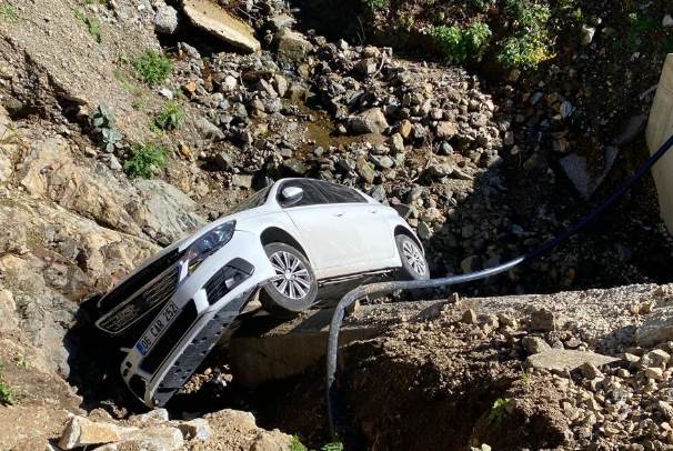 Videoyu Aç Otomobil menfeze yuvarlandı: Yaralanmadan kurtuldular!
