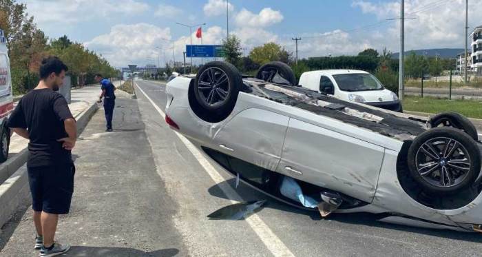 Bolu’da D-100 kara yolunda, kaldırıma çarpan otomobil tepetaklak oldu. Meydana gelen kazada sürücü aracın içinden böyle çıktı
