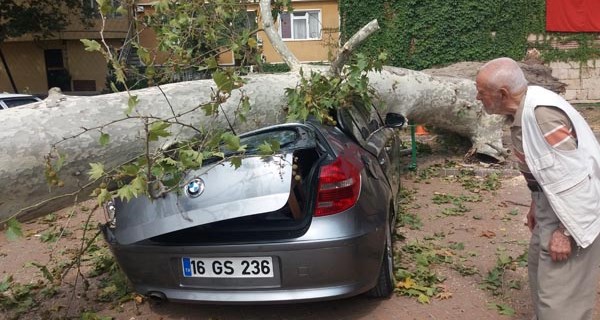 Bursa’nın tarihi surlarının dibinde bulunan 190 yaşındaki çınar ağacı köklerinin çürümesi nedeniyle büyük bir gürültüyle lüks otomobilin üzerine devrildi. Olayın gece saatlerinde olması muhtemel bir faciayı önledi.