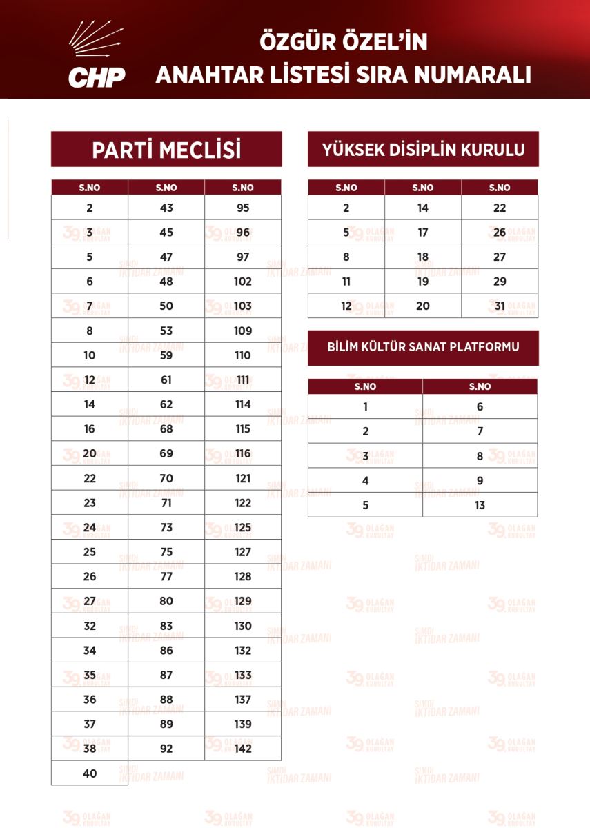 CHP Lideri Özgür Özel, Parti Meclisi’ni (PM) güçlendirmek ve Yüksek Disiplin Kurulu (YDK) kadrosunu yenilemek için hazırladığı anahtar listesinde mevcut 48 ismi korurken, 32 yeni isimle kurmay kadrosunu genişletti. Listede ekonomi, hukuk, sağlık ve dış politika alanlarından uzman isimler ile genç ve yeni partililer yer aldı.