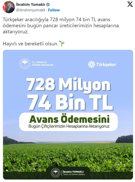 Yumaklı, X sosyal medya platformundan, pancar üreticilerine yapılacak ödemeye ilişkin bilgi verdi.