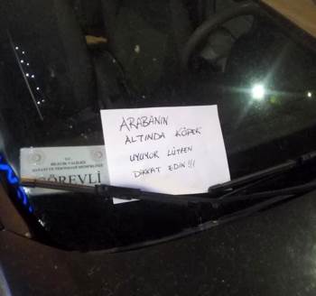 Bilecik merkez Atatürk Bulvarı üzerinde park halinde bulunan Bilecik Valiliği Sanayi ve Teknoloji İl Müdürlüğüne ait 11 EE 807 plakalı resmi aracın altına bir köpek yattı. Köpeğin burada uyuduğunu gören bir hayvansever, bir süre aracın başında sürücünün gelmesini bekledi. Araç sahibi gelmeyince aracın ön camındaki sileceğe "Arabanın altında köpek uyuyor. Lütfen dikkat edin" yazısı yazan vatandaş, olay yerinden ayrıldı. Aracın yanına geldiğinde notu fark eden sürücü, köpeğin aracın altından gittiğini fark etti.