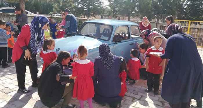 Afyonkarahisar’ın Bolvadin ilçesinde anasınıfı öğrencileri, geri dönüşüme dikkat çekmek için hurda bir aracı elleriyle boyadılar.