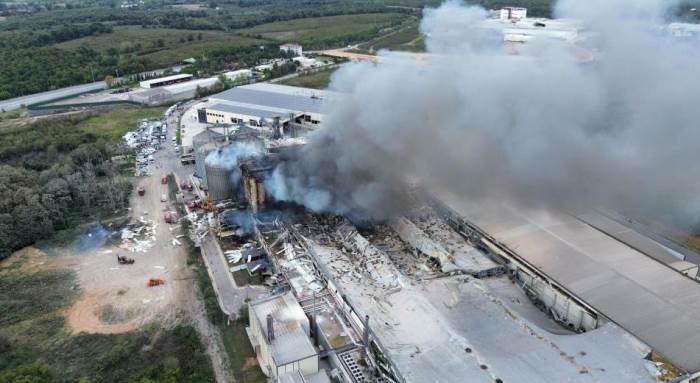 Sakarya'nın Hendek ilçesinde patlamanın ardından yangının çıktığı Oba Makarna fabrikası havadan görüntülendi.