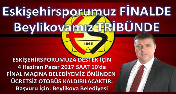 Pazar günü yapılacak olan karşılaşmanın Eskişehirspor tarihinde önemli bir kilometre taşı ve Süper Lige çıkma maçı olduğunu belirten Başkan Özkan Alp, “Eskişehirspor, sadece Eskişehir’in değil, Türkiye’nin de en önemli markalarından biridir. Türkiye’de futbol taraftarı denilince ilk akla gelen Es Es’tir. Eskişehirspor, Eskişehir’in reklam yüzüdür. Pazar günü oynanacak olan Play-Off finalinde Eskişehirspor’a ayrılacak 14 bin kişinin içinde Beylikova’dan gitmek isteyenlerin tamamını temin edeceğimiz otobüslerle Antalya’ya intikal ettireceğiz. Maçtan sonra da inşallah büyük bir coşku içinde Eskişehir’e döneceğiz. Sloganımız maçtan önce ‘Eskişehirspor’umuz Finalde, Beylikova tribünde’, maçtan sonra ise, Eskişehirspor’umuz yeniden layık olduğu yerde, Süper Lig’de olacak. Beylikovalı tüm hemşerilerimizi Antalya’ya götürüp getirmek için hiçbir fedakarlıktan kaçınmayacağız. Maça gitmek isteyen hemşerilerimizin belediyemize başvurmaları yeterli. Eskişehirspor’un Süper Lig yolundaki son 90 dakikasında biz Beylikovalılar olarak tribünlerde olacağız. Anadolu yıldızı Eskişehirspor’a finalde başarılar diliyorum” ifadelerini kullandı.