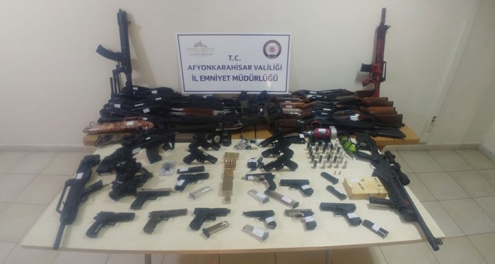 Afyonkarahisar İl Emniyet Müdürlüğü tarafından ev ve iş yerlerine yapılan operasyonda 18 adet tabanca, 48 adet av tüfeği, 4 adet kuru sıkı tabanca ve yüzlerce fişek ele geçirildi.