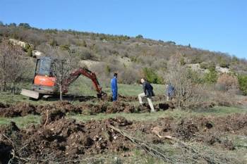 21 bin 215 hektar alanda uygulanacak olan proje çerçevesinde çalışmalar sürerken, ekskavatörlerle grodoni şeklinde toprak işleme (buror teras) yapılarak hazırlanan sahada ilk etapta 500 adet Ehrami karaçam sahaya dikilecek.