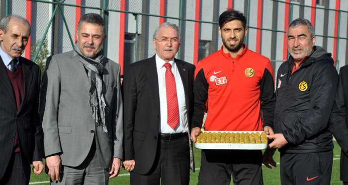 Eskişehir Osmangazi Üniversitesi (ESOGÜ) Rektörü Prof. Dr. Hasan Gönen (sol 2), tesislerde kulüp başkanı Mesut Hoşcan, teknik heyet ve oyuncuları ziyaret edip baklava ikramında bulundu.