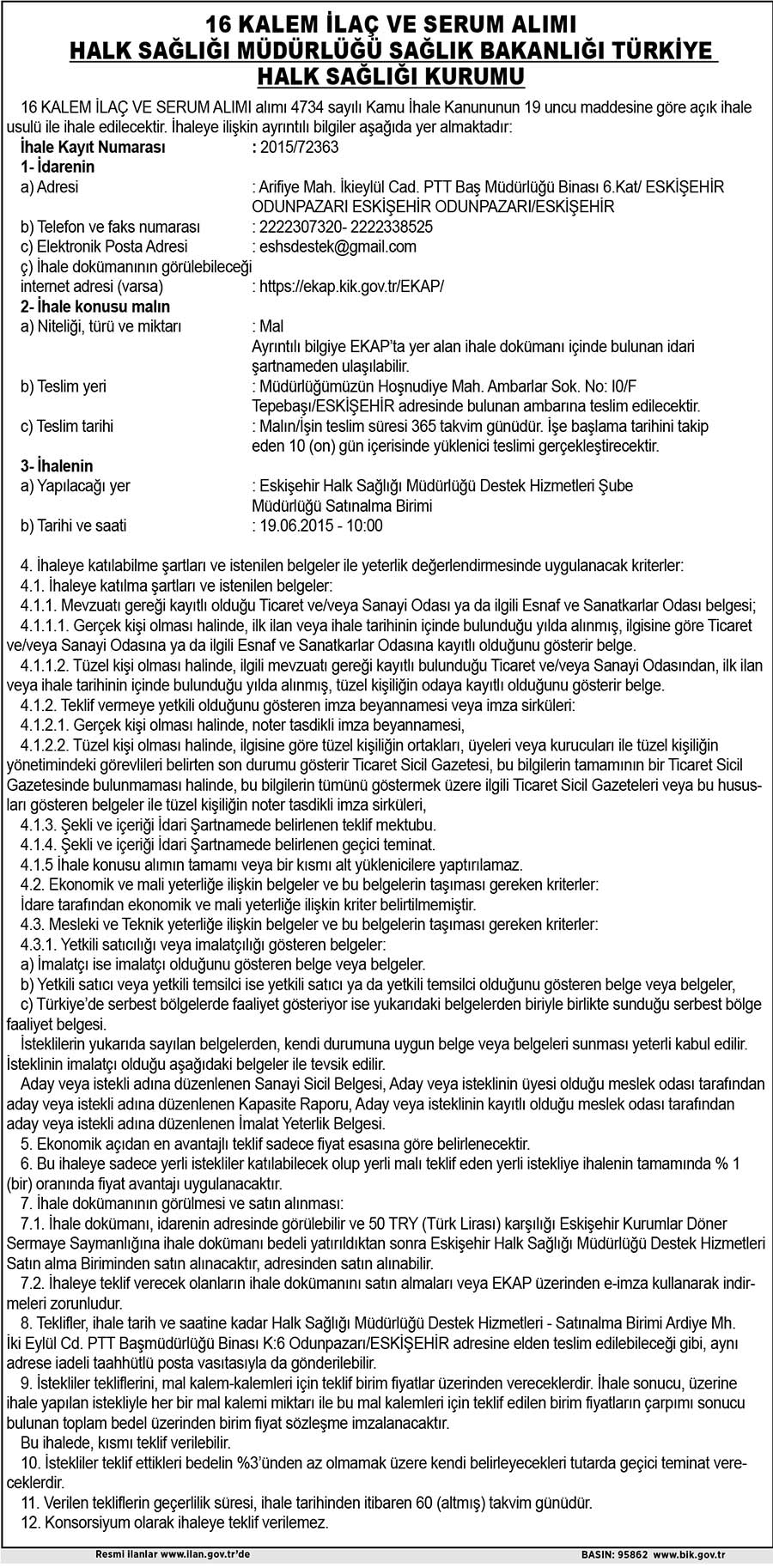 16 KALEM İLAÇ VE SERUM ALIMI